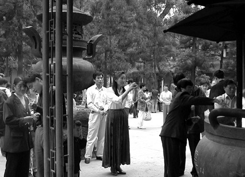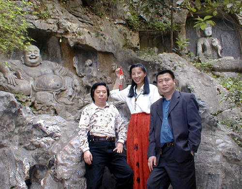 一进房间大家先忙着去冲澡洗尘,我觉得没什么尘,架上笔记本尝试连接上网。163漫游登录需要邮箱账号,我没有,试了169可以上,但不知为什么所有网页都打不开。打电话回去找MH求救,刚想起这次出来之前都忘了告诉他。于是找到他时首先报告:“我在杭州。”他笑着问:“跑那儿干嘛去啦?” 问得多么奇怪!他给了我他的163账号,我试拨,仍然不能连接,不知是怎么搞的!阿钢说干脆你用我的账号好了。终于登录成功!在异地,用笔记本看到自己的主页和论坛,感觉很好玩儿。我正发愁打电话联系不到okok,上了坛子就赶快留言给他,请他打我手机联系。 大家冲完澡立即出发,上午先去了灵隐寺。 灵隐寺和别的寺院不同,很容易记住。它不是孤单单一座庙宇,而是与“飞来峰”、“一线天”等自然景观完全溶和在一起,成了风景群中的一景。进了山门先沿着峡谷之中的石板路漫坡向上,走进去很深才看到寺院。那一路空山鸟语,隔着一道山涧,左侧就是树障竹影中的奇峰怪石。天阴着,完全没有阳光,一片轻雾迷蒙之中,如入仙境。 |