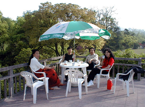 挑了二楼露台上一张靠栏杆的桌子,用遮阳伞遮挡了下午的阳光。中午在灵隐还下过一阵小雨呢,这时坐下来却是拂面而过的温柔的风了。“暖风熏得游人醉”,可能就是这样?反正从北京来的我们,人人都醉得差不多了。大家说起北京的沙尘暴,恍如隔世。他们都说,小路今天写日记,主题就写“杭州的风”吧! |