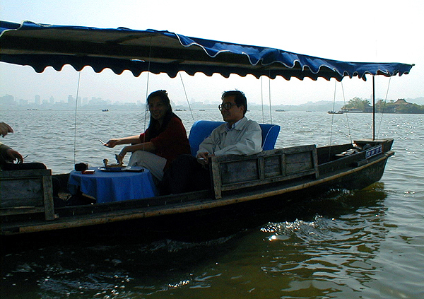 七点之前醒,发现“笔记本”还抱在身上。幸亏我睡觉从来都是这么老实的,一动不动,要不那可怜的电脑早就甩到地上去了! 怕珠儿醒了,两个人会抢洗手间,先爬起来冲了澡。珠儿起来收拾的时候,我已经连淡妆都化完,该换衣服了。珠儿命令我今天穿红色,因为她要穿黑。她说要考虑“团队的色彩”。我说我一向赞赏团队精神,但从没想到穿衣服也与团队精神有关。她说那当然了,要不照片拍出来多难看?!我说好好好我穿红!今天穿旅游鞋,不能再穿红裙子了,只好对付一件红衬衫。 利用早饭之前的时间上网看了看帖,没看几眼,okok就来了。今天是星期天,他说可以陪我们玩儿一天。他这一去,今天就更丰富了,因为在我眼中,他就是一个知识宝库! 上午到西湖划船,比昨天好,一切顺利。七个人,两条船。我和okok、ZB、南飞在一条船上对坐,面前的小桌上摆满了好吃的。我还给okok和王爷他们买了啤酒,他们就坐在西湖的小船上,就着“杭州的风”喝啤酒,看着他们都感觉是享受! |