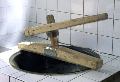 | 一走进这座农家小院,就闻到了久违的柴灶炊烟气息。风絮蹲在灶前帮忙添柴的照片没照好,实在可惜。当时板正在一旁笑嘻嘻说:“风絮呀,快叫叔吧,要不就把你卖到这儿当柴禾妞儿啦!”要是能留下那张“柴禾妞儿”的照片该多好玩儿! 这里这张照片是板张罗让留下的,他说可以考住很多人——这个炊事工具是作什么用的?刚开始我猜是铡刀,设想把帆硕大的头…… |