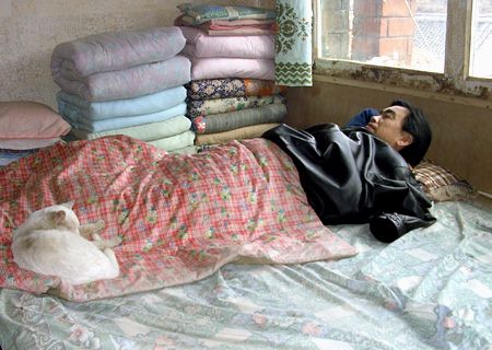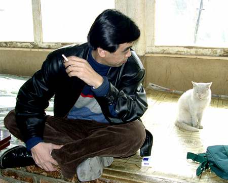 到现在仍怀念那“遛达蛋”,还有用葫芦瓢盛到碗里的小米粥…… 饭后板哥说:“我瞧你们这样儿,也不象还打算爬长城的了。”我赖兮兮笑了笑——本来我就没打算去爬山!于是出现了这幅场景:知青,知猫,热炕头儿!板在睡着之前还来得及吟出: 我睡炕之头, 猫睡炕之尾; 日日思猫不见猫, 共饮一瓢水…… |