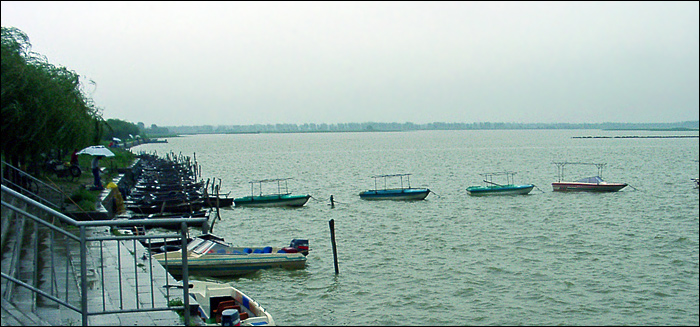 | 雨势恰恰在这时减弱,我甚至还能跑下车,钻进湖边的遮阳伞下拍了两张照片。 湖上的小船全都靠岸系了缆,横的成排,竖的成线。它们飘飘摇摇牵在一起,把辽阔的湖面全都留给了萧萧风雨。 ![]() |