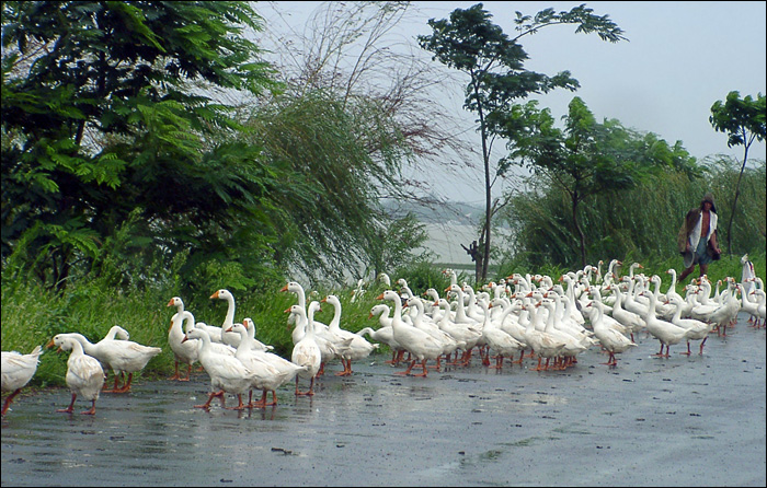 | 很不甘心,往回走走得很慢,走走停停。 在路上拍到了这些鸭子。我们想,放鸭人应该就是微山湖真正的主人了。还有那些鸭子,它们也是微山湖的主人。 微山湖的鸭子很奇怪——它们摇摇摆摆甚至是大摇大摆地在路上走,但是只要一遇到汽车,立即全体站住,同时转向湖水一侧立正,只将PP对着我们。直到我们走过,它们才会一起转身,继续前进。 非常整齐!不须任何号令!一路上遇到的鸭群,全都是这样。 时间已经过去了四年,我和盼盼到现在还清清楚楚记得那些鸭子,一说起来就会笑一笑。 |