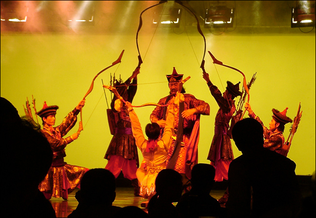 | 整场晚会的主题,是欢乐喜庆的蒙族婚礼。新郎要拉得开强弓才能娶到新娘。 |