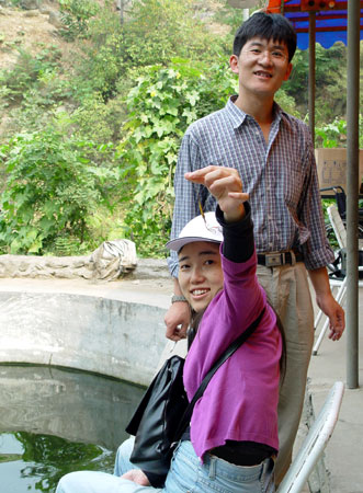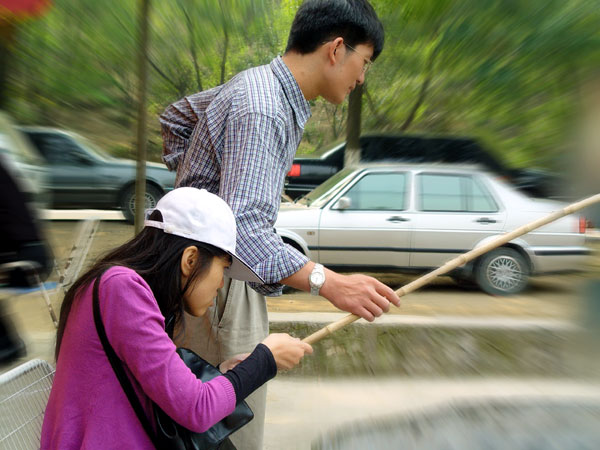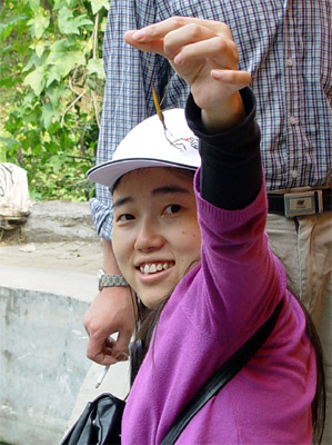 除了钓鱼,小山东还帮相月抓到一只蚂蚱(好象是蚂蚱?),把她乐成这样。 放大了他们两人的这张照片放在下面,是送给他们的我的感动。 |
