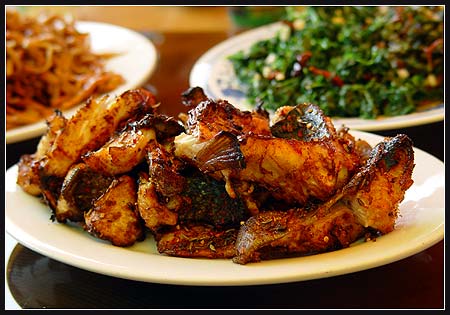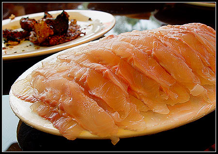 一共钓了两条,另外一条生吃。相月今天在我们热情怂恿下练习吃芥茉,样子比较痛苦,本来也想拍下来,LX说别人会以为我们欺负她了,所以没敢拍。 后面这条端上来的时候,前面那条已经成那样了。 |