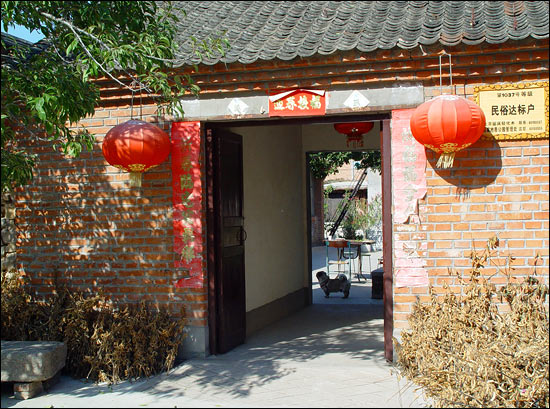 | 绿地,人家。我们看到门上钉着“民俗达标户”的牌子就径直闯进去了。后来才听他们说,象这样的达标户现在村里已有十几家。 | ![]() |