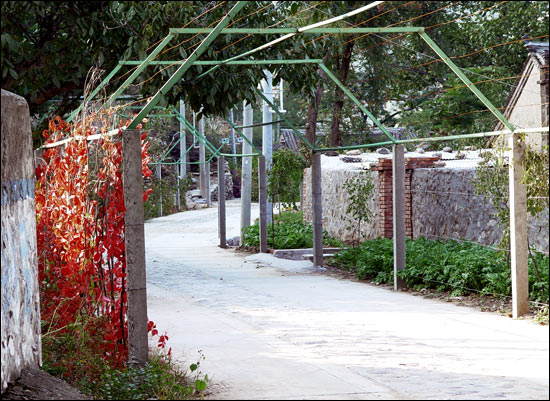进村的道路。前边转过弯去就是一片绿地,感觉近似于城里的街心花园。 花廊刚刚搭起架子,明天的景象尚在想象中。 |