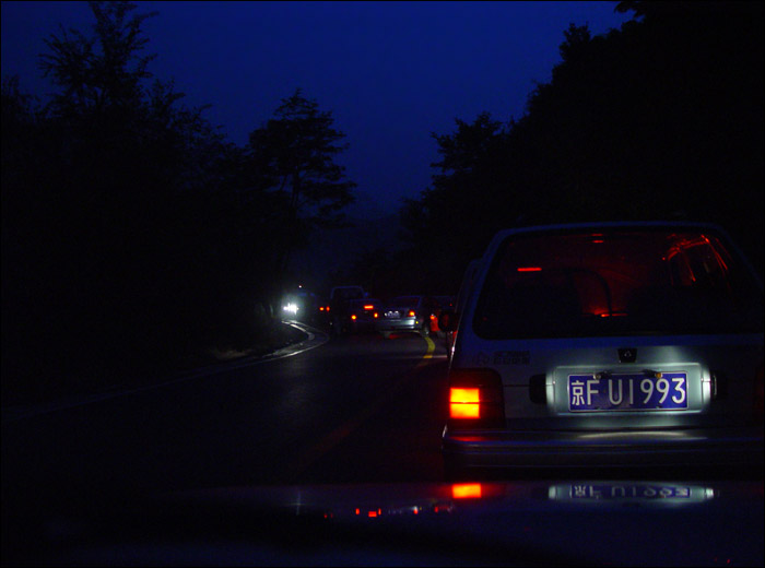 | 好象过了汤河口之后没走多远就开始爬山了。盘山道弯弯曲曲,这边的车却多了起来,特别是重型载重车明显增多。另外还有很多“二把刀”司机在车前车后死挤活抢,害得我们一路骂骂咧咧。 爬到大概是半山以上的地方,熊指着一个岔道口告诉我们:那条路是通向“崎峰茶”的,崎峰茶也是一座山的名字,翻过那座山就是八道河——箭扣——老赵他们家。我们怎么跑到这儿来了?!我很惊讶!很晕!不知身在何处! 云蒙山还是挺高的,终于登上山顶时天差不多已经黑了。拐过最后一个路口,熊正式宣布:“现在开始下山!”但是没走出多远,突然遇到堵车!这一堵就堵了个纹丝不动。一路上死赶活赶的那些车就跟我们堵在一起,也不知赶来赶去都赶了些什么。呼伦很惊讶:山上本来没那么多车,从哪儿忽然一下冒出来这么多啊?! 原地等了很久。对面车道有时有车上来,有时没有,断断续续的,也不知下面到底出了什么事。从路边的护栏那里望下去,可以看到下面的盘山公路上一片红色的尾灯,大家全都趴着!我们身边已经有些司机下了车,黑暗中可以听到有人很大声地打着哈哈:“得!给堵山上了!带铺盖了嘛?” 熊说:照这样子,搞不好真得堵到半夜了。但我和呼伦都挺兴奋,大家不约而同想起了板筋的《夜过秦岭》!我们也有机会体验一下了啊!管它什么岭,反正不都是岭嘛! 我本来已经收起相机,这会儿又翻出来,抓紧练习拍夜景——看上去真的跟“夜过秦岭”差不多啊!其实天已经很黑,加了“曝光补偿”,照片拍出来天又变亮了! ![]() 后来看着实在通车无望,老熊痛下决心掉头,真的去走崎峰茶! 迎着堵车的长龙往回开,那些车全都茫然望着我们,我们就象检阅一样!居然没人跟着我们走,老熊为此颇有些失落,他说多数的人都不知道还有别的路可走,这帮傻子! 天已彻底黑透,山路上决无路灯一说,全靠车灯照着了。我兴奋过后开始害怕,琢磨这么黑漆漆的走山路是不是太危险,要不然干脆找个地方住下,明天天亮再走吧?但熊说天黑其实才不危险,弯道会车远远地就会有灯光报警,反倒不容易顶上。他还说:“别看俺白天眼神儿不济,天一黑视力马上提高!” 切!他又不是猫! 返回刚才的岔道口,从那里转向崎峰茶。刚才几句无心的玩笑话突然应验!我已经想好了,实在不行真的就去老赵家——索性再玩儿一个夜宿箭扣!但是老熊哼哼冷笑着告诉我们,老赵家还在山那边,崎峰茶是一座很高的山,路程远着呢! 驶到山脚下时,我扒着前窗向上张望了一眼,崎峰茶黑黝黝挺立在夜空之下,真的好高啊! |