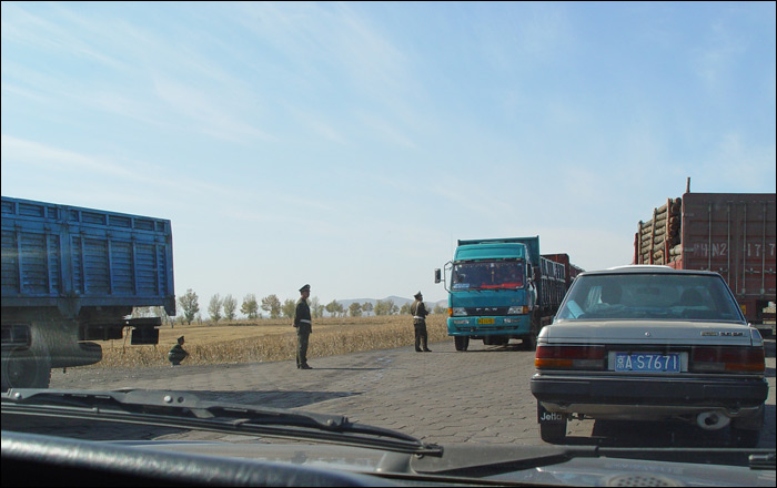 | 上面这张照片是前天进山西时拍的,一路上这样的情景太多了。有些路卡是这样临时性的,站上两个公路警察马上就堵车。有些路卡是长久性的,司机们都知道到哪里“排队罚款”。 |