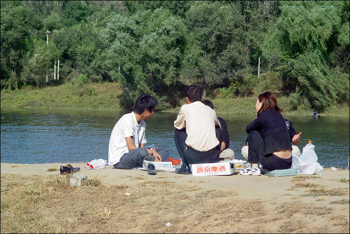 这几个孩子坐在护坡上玩儿烧烤。 |