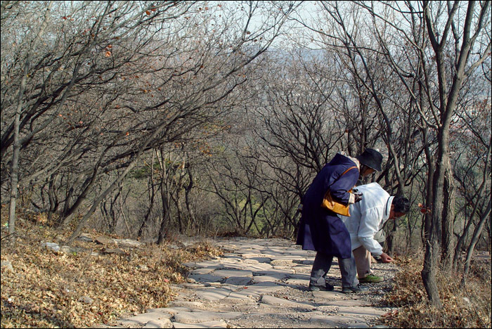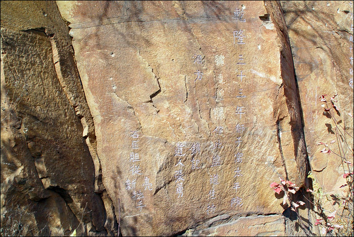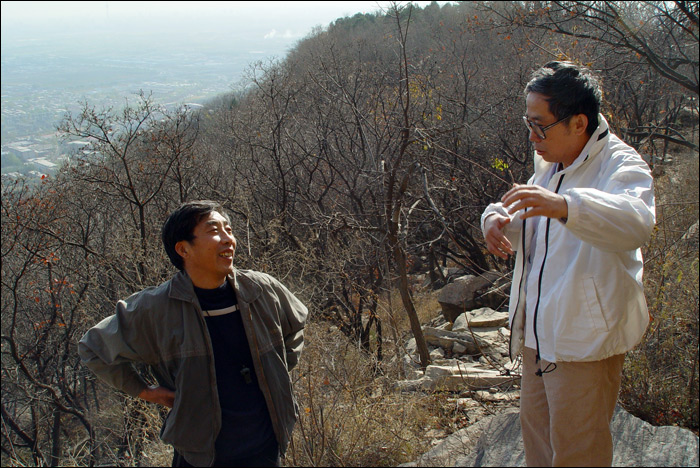 在“重拍百年老照片”行动中,北京地区有两个难点,其中之一是位于西山八大处附近的福惠寺——狮子窝。老熊已经跑去四趟,属于先遣队性质,或者类似于土匪作案之前的“踩点”。经他勘察,狮子窝的大体方位和行车路线都有了眉目,但他在山前山后转来转去,一直还是没有找到狮子窝老照片的具体拍摄地点。第二次去的时候,他发现了带有狮子窝标记的佛字崖刻,但是扩大范围继续侦察时,再往山上走发现道路延伸进入军队营区,只好掉头返回。随后就听说进入秋冬防火季节,干脆封山了!拍摄行动被迫搁置。 十一月十一日我们一行四人再去狮子窝,主要是因为“老聂”的突然出现。 老聂是老熊的故交,长期在林业出版部门供职,本人实际上却是一位画家。非同凡响的人物啊——身上装着心脏启博器,驾一辆轻便摩托跑遍京郊大小山川!听说我们的“百年照片”拍摄计划之后,他立即出动,独闯了一次狮子窝。那一次他进入了营区,在那里找到了狮子窝塔院。这又是一个重大发现!但百年老照片上的主要场景——那座石桥等等——依然踪迹渺然。 我们决定继续再去寻找一次。老聂有林业部门的工作证,我们想试试凭着他这个“大PASS”能否闯过“防火封山”那一关。 十一日早上,呼伦先从南郊赶过来。因为要等她,所以我不慌不忙出门就没着急。肩背手提我和狼狼的全套行头下了楼,才发现什么都拿了就是没拿车钥匙!老熊的新窝很近,跨过长安街去他那里也就一公里,我实在懒得再上楼,于是决定步行上路,直接去投奔昏熊。 这是多么错误的决定!首先是我忘了狼狼“恐高”,不敢上过街天桥!软硬兼施,耗时无数,最后还是抱着它过去。这个小肥猪!早上天气还很凉,过了桥我却已经一身汗,刚出门还没正式上路就已经开始筋疲力尽。 昏熊听说我走着过来,干脆开车过来接我们了。老聂这时已在西直门老熊故居待命,我们到那里去接他,索性一起进屋烧水吃了早饭。我这时才头一回见到老聂,他比我们年长几岁,热情直爽,谦逊而不拘谨,一见面就让人感觉非常亲切。进屋刚坐下,他就翻出随身背着的“大部头”,给我看他查到的福惠寺相关资料。我没戴老花镜什么都看不见,只看见书里夹着大大小小的纸条,于是知道这是一个勤奋好学而且很认真的人,而且“又”是一个有学问的人! 后来又拐去接上呼伦,然后正式向西山进发。依老熊说,其实从他的新窝直接开过去只不过20分钟车程,但我们这一早上的折腾,已经一个多钟头出去了。 天气非常好,还没出五环路就能清清楚楚看到西山了,连山顶上军队架设的雷达天线都靖晰可见。据老聂说,山顶上实际上是空军和陆军两处营区,空军稍靠南,陆军在北,两家相邻很近。他找到的“狮子窝塔院”就在南边空军营区稍低一点那片树林的位置…… 老熊开着车说:“你赶快想词儿吧——待会儿到了山底下掏出大PASS来,怎么懵人家?” 老聂说:“不行,这种词儿不能事先想!” 我说:“就是!编瞎话都得靠现场发挥!临时灵感!”众笑! 呼伦当时说了什么我忘了,只记得老熊立即警告她说:“呼伦你可千万别说话!你一说话肯定就憨憨地给说露馅儿了!属于不打自招的那种!你可千万别说话啊!”我们全都哈哈大笑! 在八大处附近离开正式的公路转向山里,果然还没走出多远即被禁止行进——路障和检查站。老熊停下车摆摆头对老聂说:“去吧,该你上了。”于是老聂独自下车过去交涉,我们坐在车里遥望着他跟那位值班的壮汉比比划划瞎侃。不一会儿就见他一脸轻松地跑回来,成了! 拦路的道杆抬起来,我们欢笑着通过封锁线!此前还商量了“万一不成”的种种应对方案,这会儿全都用不上了。 我问老聂到底怎么临场发挥给人家瞎编的,他学说了一遍,我们又大笑了一回!编就编吧他居然还给人家编出了“一二三”!不过他说盘查还真是挺严的,那位壮汉要他自报姓名,然后核对证件,还来回打量着仔细比较了“真人儿”与照片…… 上山了!事先已经听老熊讲过这里的山道狭窄,今天亲眼所见,果然!弯弯曲曲的山路仅一车宽,万一对面来车,必须有一方停车或倒车,找相对稍宽的地方大家错开通过。坡度很陡,弯道相连,这段路走了很长很长。设想如果没有老聂的话,我们很可能就得自己一路走着上来,那可真的是太要命了。感谢老聂啊! 车到半山腰,老熊把车停在道旁仅有的一小块空地上。我们全都下了车,狗狗们赶快喝水。 开始感受到山风了,回头远望,城市已成盆景。 ![]() 仅仅十来天之前我到西山,红叶将将还只红到一半,照片中“赤橙黄绿青蓝紫”缤纷一片。当时还盼着山林赶紧红透呢,今天再看,忽然已经残枝败叶了剩无几!今年暖秋,竟成短秋,如此匆匆就过去了。 残枝败叶也拍一张,记录我们寻找狮子窝,是在这样一个季节…… ![]() 老熊发现的佛字崖刻就在这附近,老聂也已经来过这里,今天再去一趟,只是因为我和呼伦也想看看他们的发现。 一条小路从大道上岔出去,非常不起眼,真不知先前他们怎么会想起扎进这里来寻觅,这是很容易错过的啊!看来整座青龙山确实已被“地毯式”搜索过了。 封面照片就是在这里的山路上拍摄的。那张做了切裁处理,这是原片的样子。 ![]() 下面是另一张。这张照片中的“考古狼狼”很容易被忽略,敬请留意:) ![]() 小路蜿蜒着绕过一道山坡,一座高大的崖刻赫然出现在眼前。 据说这是北京地区最大的佛字崖刻之一。 !