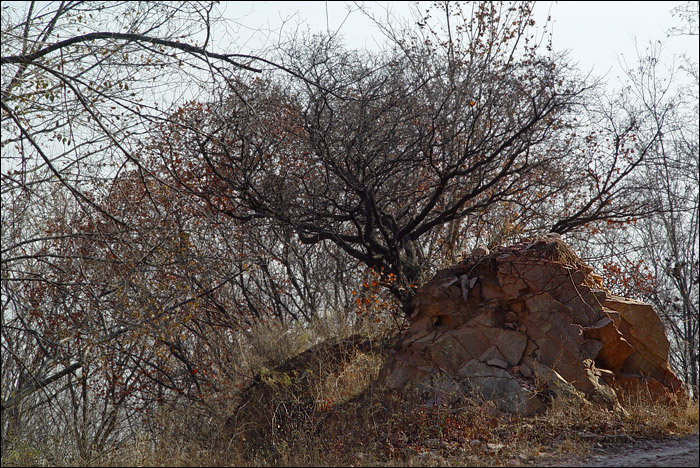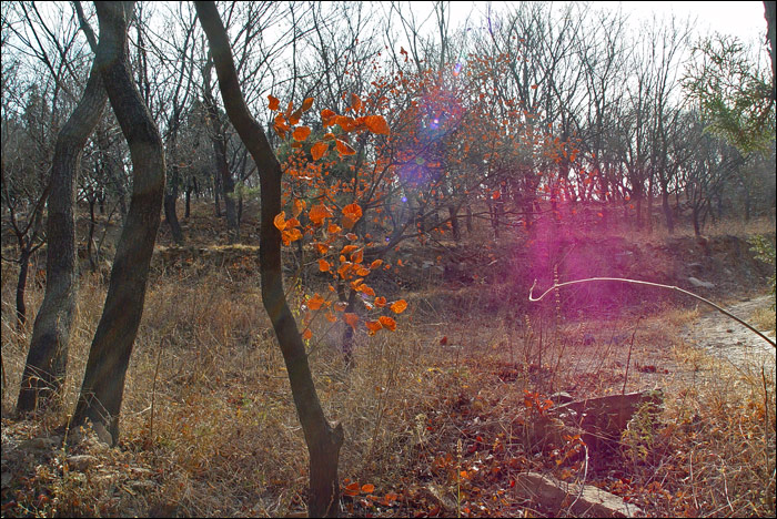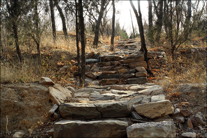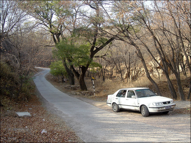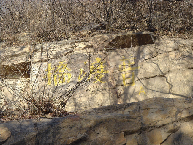 他们几个从山上下来的时候,老聂远远招呼我过去看古香道,他说这里的古香道“非常典型”。好象只有这一段古香道(直至山上福惠寺)是这样完全用石板铺就的。不知修道碑上所记载的“太平院行僧源方、弟子广达,月米助工,共修道三百六十丈”是否指的就是这一段。 ![]() 重新上车再往山下走的时候,刚刚经过那个三岔路口,老熊好象在路边的岩壁上看到了什么,忽然把车停下来说:“那不是普渡桥么?!” 我们本来已经全体放松,只顾说说笑笑聊天了,这会儿“刷”地提起精神,全都转过去看普渡桥。 普渡桥只是岩壁上留下的三个神秘的字。在网上查到的资料好象都仅仅提到这三个字,但是没人亲眼见过这个桥,谁也不知道它到底在哪里,是什么样子,甚至它是否真的曾经存在。这三个字为什么要写在岩壁上,而不是写在那个“桥”上呢? 后来在家里独自对着照片“相面”,注意到“普渡桥”三字的右下角还有一个“A”?! 也许这里的字只是人家正经考古的人作的什么记号吧,但它至少是在标记着一个有意义的方位。 ![]() 事先已经知道只有字,没有桥,所以我们坐在车上看了一眼本来就准备走了。但是老熊盯着车边的反光镜忽然又有所发现地说:“两棵老槐树?!” “普渡桥附近两棵老槐树”,这是“东茶棚遗址”的重要标记。这回他们就全都下车了。而我到这时已经连下车原地拍张照片的劲儿都没有了,就坐在车里一动未动。 上下这两张照片也都是老熊拍的,从下面的照片上可以看到我赖在车里的样子。 下面这张照片还拍下了那个“重要的三岔路口”。我们刚从左手那个方向转过来,那是通往后山——陈家沟方向的。往右上山就是狮子窝,我们去拍石桥、塔院,就是从右手那里上去、又原路返回的。而早上刚上山时拍到的摩崖佛字,比现在这个位置还要低一点,后来继续下山的时候又走了一段,再次经过那里。 这两棵老槐树,大家都曾经路过,但是谁也没注意,所以路过都成错过。今天怎么什么都看见了,今天真是一个“发现”的日子! ![]() 所谓“东茶棚遗址”也只是留下这样一处地标,其它什么都没有了。据说近旁的崖壁下还有一些散碎的瓦烁,被怀疑为昔日茶棚残迹。 我在东茶棚这里隔着车窗拍下的唯一一张照片就是下面这个了,算是今天考古行动最后的纪念吧。 ![]() 到底没喝粥也没吃饭。老聂说下午还有事,吃什么饭呀!于是下到山脚下,再二十分钟车程回城,大家解散回家。 我到家快四点了。非常累,累得晕头转向!走到自家楼底下,忽然发现只背着一个空空的摄影包,相机不见了!每次出门“搞摄影”都丢东西,这回最彻底,连吃饭的家什都丢了!晕了一下才想起,最后一张照片拍完,把相机扔在后座上,那是老熊的车,于是相机就留给老熊了。幸亏中间换过存储卡,今天的前一部分照片在手里。后来老熊来电话告知拾得相机一部,我连乐的劲儿都没了,说好明天再去拿,今天不干了,今天啥也不干了。 那么累,进门第一件事还是坐下先看照片。我最不满意的就是“一片石”的照片,于是就有了后来的专门再去一趟,“补拍一片石”! |