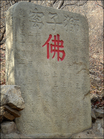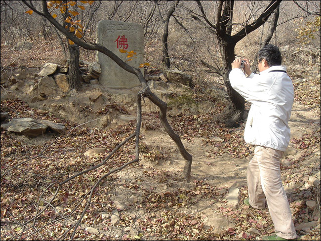 他们刚一走,我就开始后悔。不是因为错过古迹而后悔,是因为孤独中的恐惧。 剩下一个人的时候,山里好象忽然安静下来。猛然想起“两名女大学生被杀案”就发生在这一带的山里,而且至今还没有破案! 于是我不敢离车太远,也不敢关上车门,随时准备着一有什么风吹草动立即带着狼狼蹿上车! ![]() 竖着耳朵听周围动静,听见风吹着灌木丛唏唏嗦嗦发响,又想起除了坏人,可能还有狼? 山里真安静啊,各种各样的鸟儿远一声近一声唱着,很好听。这就是所谓的“空山鸟语”吧。 偶尔还听见隐隐约约象有人声,是大山之中远远传来、略带着回声的那种。在山里一有这样的回声就不好判断距离了,也说不定那声音真的非常遥远,甚至是在山的那边也说不定…… ![]() 盼着同行的几位赶紧回来,越是望眼欲穿越感觉时间漫长。一边哆哆嗦嗦东张西望小心着,一边就在近处拍了些蓝天白云和枯枝败叶。今天真的是功德圆满,就连这里的荒山我都觉得并不浪费——体会一下蓝天白云,枯枝败叶,空山鸟语,旷谷回声……我觉得这些实际上都是古香道的一部分! ![]() 他们去看的修道碑其实是这个样子。这是老熊带回来的照片。 老聂应该对修道碑印象最深了,前次他独自“搜山”,就是从这里顺着古香道摸上狮子窝塔院的。 ![]()