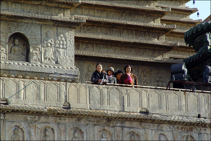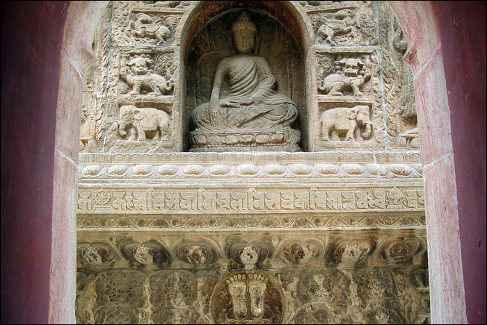 | 下图就是那个“佛足迹”。类似的佛足迹在全国好象共有十余处,但北京地区仅此一处。这是在正中那座大塔的基座上。传说印度高僧带来的五尊金佛就藏在这座塔中。 讲解员告诉大家,此处雕刻的寓义是“佛伸出脚来让大家顶礼膜拜”。后来在网上看到另外的说法,认为这是“佛迹遍天下”。其实佛的真义应该是“佛在心中”?无论如何,我总觉得这个创意非常不内涵,不写意,不那什么。 ![]() 资料: 五塔建在金刚宝座顶部的台面上,中央为一大塔,四角各置一小塔。五塔均为密檐式,全部采用青石砌成。中央大塔高约八米,下层为须弥座,其上有十三层密檐,每层密檐下都刻有小佛龛及佛像。塔顶以仰莲、相轮、华盖宝珠组成铜制塔刹。四角小塔形同大塔,只是高度约低一米,塔檐十一层,塔刹为石制。立於高大宝座之上的五塔及其它建筑,给人以高耸而错落有致、层次分明的感觉。 ![]() ![]() 佛经上说,金刚有五方五界:佛部(中)、金刚部(东)、宝部(南)、莲花部(西)、羯摩部(北)。每部有五方主佛:中为毗卢遮那佛,东为阿闲佛,南为宝生佛,西为阿弥陀佛,北为不空成就佛。佛又有五方宝座,即动物坐骑:大曰狮子座、阿閦象座、宝生马座、阿弥陀孔雀座、不空成就迦楼罗金翅鸟王座,所以五塔寺金刚宝塔宝座和五塔的须弥座四周都有狮子、象、马、孔雀、金翅鸟王等五种动物形象的雕刻。 ![]() 宝座和五塔的须弥座上密布着佛像、五佛宝座、八宝金刚杵、菩提树、法轮、花瓶、天王、罗汉、梵文、卷草等…… ![]() 下面是我们考古队的工作照。 ![]() ![]() |