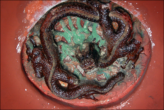 | 罩亭上方有盘龙藻井,宇鹏说这个藻顶“刷漆刷得都快流下来了”。 解说员讲解的时候我一直在忙着拍照。这张1/8秒! 鼓掌!这个就无墙可靠了,完全是高举高打。每次象这样高举高打之后放下来都得喘气儿。 |