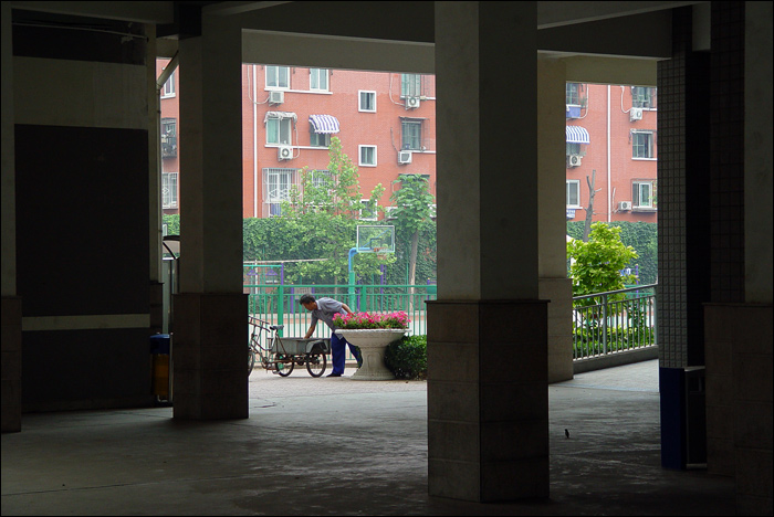 | 上图拍到了一个真正的“园丁”,又让我想起文革中被同学们迫害致死的于共三老师。我记得于老师好象是“特级教师”,他教我们古文,让我们背《古文观止》里的一些文章等等。他说古文不是读的,要“吟诵”,还站在讲台边上给我们作示范,两眼一闭,双膝略弯,咿咿呀呀就开始吟唱。我们在下面哄笑,他一丝不茍象没听见一样。我最后一次看见于老师是在教室里,他坐在一张凳子上,周围站着几个男生一边聊天一边摸着他的光头取乐。于老师双目紧闭,毫无表情,那毫无表情的表情已经是万念俱灰。我当时是从门口走过,一眼看到感觉很惨,扭头就走了。后来听说于老师跳楼了。 下图就是我们“中学部”的西楼,于老师在这里教过我们各个年级的很多很多同学。不知他是从哪一个窗口跳下来的。我觉得这座楼好象已经完全重建过,那个窗口也许根本不存在了。 |