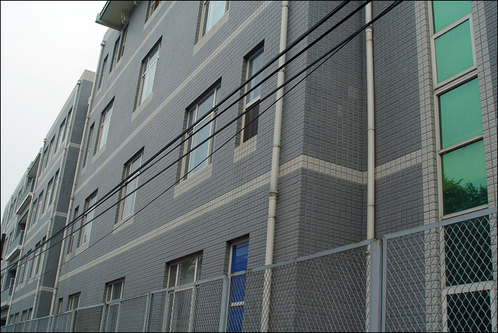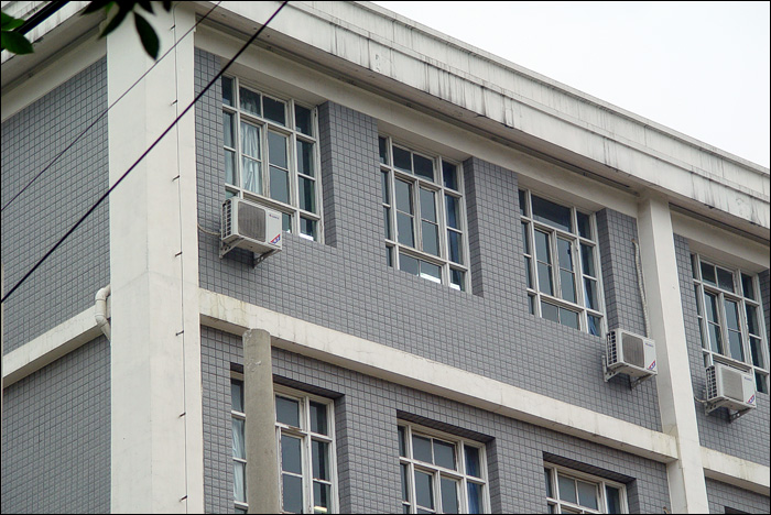找一个角度躲开那些大树再拍“南楼”。天确实很阴,好多教室都开着“管儿灯”呢。这座楼还是当年的,没有重建过,楼体上白色的框框是七六年大地震以后加的“圈梁”,横框是楼层,竖框是教室之间的承重墙,每间教室三扇窗。望见教室的窗子真是感觉很亲切。大概凡是好孩子看见教室的窗子都应该感觉亲切吧,因为好孩子们那会儿成天擦窗户。 |