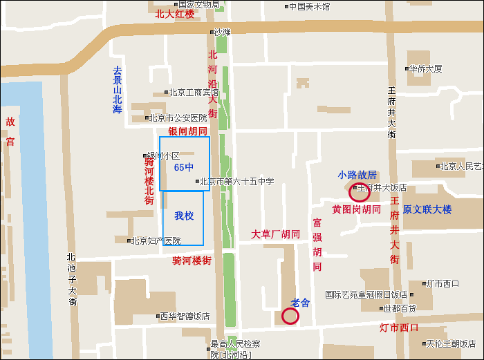 | 6月12号那天送妈妈上医院,等待妈妈看完病那段时间就转到小时候的学校拍照片去了。前不久刚刚写过《谁能证明我插过队》,里面曾经提到俺的学校,那次没来得及拍片,这组照片就算补上插图吧。 担心大家不知道我说的哪是哪,特意做了这张地图。图左有故宫,图右有王府井大街,上方还有沙滩北大红楼,看这几个地方大概就能知道方位了吧。 图上除了学校,还有俺的故居。我9岁时搬到那里。一直住到盼盼3岁,住了22年。离开那里也有20多年了,那座“机关大杂院”早就拆了,半条胡同都拆了,盖成了现在的“王府井大饭店”。 |
