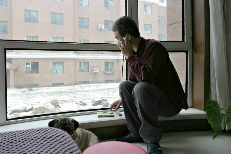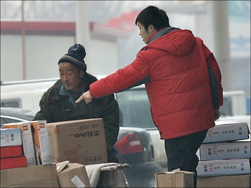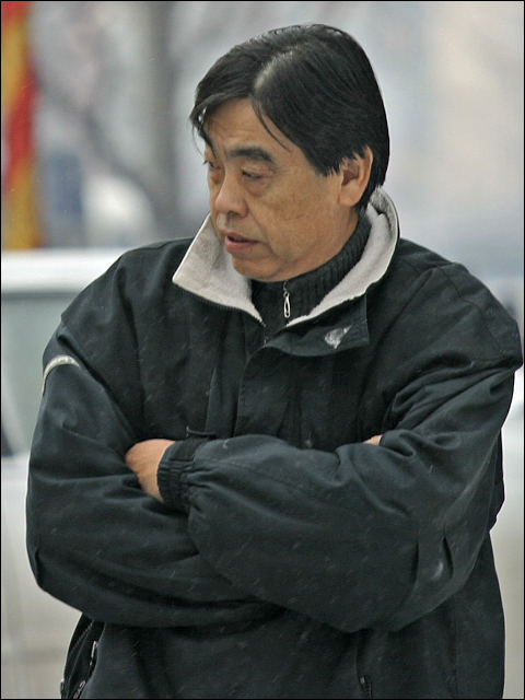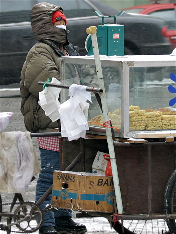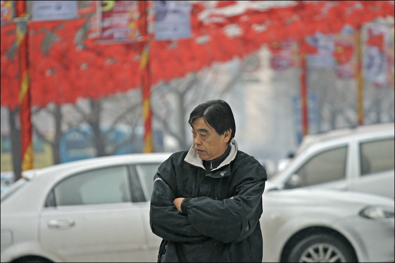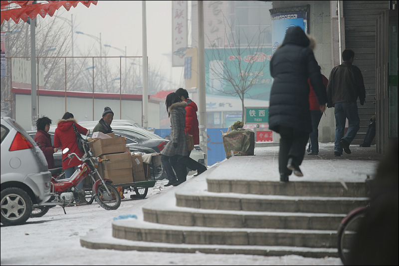 在赵丽经营的小画廊里见到了她本人。我把相机扔在车上没有带进去,所以没有任何照片。其实瞎爷爷说本来问题不大,赵丽是被大大小小各种媒体折腾着长大的,她应该早就不在意了。只是我自己不行,我实在不能拿镜头对着一个身体严重残疾的人。 赵丽穿着薄薄的羽绒服,袖筒很长,她的双臂垂在袖筒里,乍看上去没有什么特别不一样。但是交谈中忽然有电话打进来,她很熟练地甩掉鞋子用脚趾夹起话筒听电话。那个突如其来的情景真是让人心里一震,而且很疼。我们没有看到她用脚趾夹着画笔作画——她画工笔! 很多事跟我预先想象的不一样,赵丽并不是简简单单地躺在社会关爱之中享受赞誉,她也有很多艰难,很多不平,甚至愤怒。也许桑叶有十几年前的印象作比较,感触还要深刻一些。反正我是相信:当年那个开朗乐观、要强而单纯的小姑娘是很真实地长大了。 我把狼狼也扔在车上了,怕它冻死,桑叶他们还没谈完我就提前出来了。坐在车上放下车窗,就近随意拍了一些雪中街景,以及在雪中忙碌着的生活在这座城市里的普通人。 |