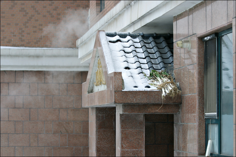 | 我喜欢这张简简单单的照片—— 已经开始改变的住房、不变的大葱和炊烟、似乎永远不变的雪。 ![]() |