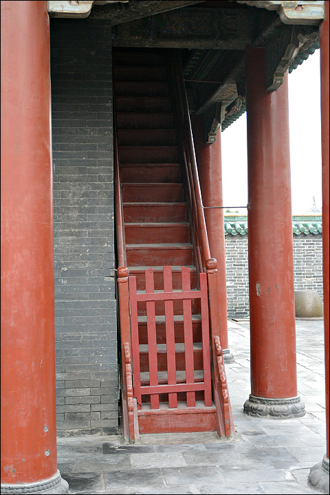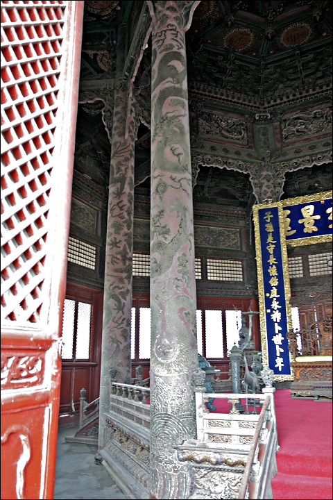 我一直非常奇怪皇上的房子为什么要造得象个亭子?!已经看惯了四平八稳的大殿,哪一级的大殿应该多少跨多少开间好象也是规矩森严,所以这个看着就很另类。这个亭子是八棱八角的,说不定真的跟“八旗”有关。另外“八面透风”的这叫什么结构,桑叶刚说的我又忘了。据他讲解,这是有政治体制上“完全透明”的涵义。![]() |