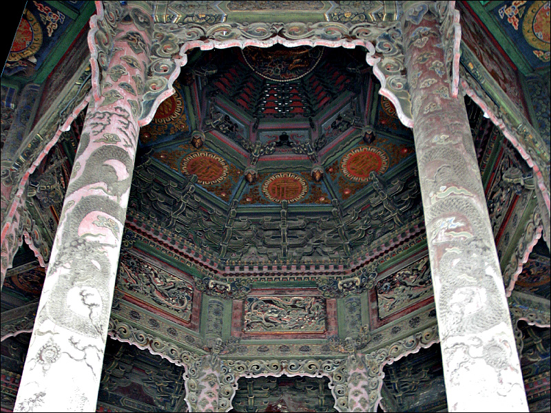 记得讲课时说这东西好象是叫“藻井”,但愿没有记错。图案、色彩、总体风格,我相信这里面是会有很多说道的,可惜都没有时间细看细问细说了。![]() |