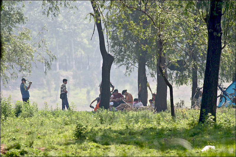 | 2008年5月25日,头一次去北郊沙河水库。当时四川大地震刚过,灾区仍在水深火热之中。全国哀悼日自19号开始,据说那是为废墟中的亡灵们作“头七”。我们所有的人可能都没有在同一时间里为那么多人、特别是为那么多孩子作过“头七”。我们大院儿的防空警报声原来是那样的,那也是头一次听到。同时还有隔壁大院儿的防空警报,还有近在咫尺的北京西客站的火车鸣笛……声犹在耳,挥之不去。守在电视机和电脑前的日日夜夜,那是压抑得喘不过气来的日子。终于我想反抗一下喘不过气来的压抑,那天背起相机带着狼狼去了沙河。 下车是上午九点半刚过,大体上勉强还可以算是“清晨”吧。湖边的树林中薄雾弥漫,天地间到处都是各种鸟类远远近近此起彼伏的叫声。游人稀少,视野之中见到的人们看上去都很平静。只是平日里必不可少的水边烧烤那天一处都没看到。“令人喘不过气来的压抑”即使在这里也同样存在,淡淡地,看不见,但它无处不在。 |