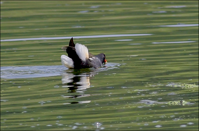 苇丛附近的野鸭子。远处那只叫什么名字我还没有核实,而近处这个居然号称“黑水鸡”!在湖面上游来游去的鸡!真是不可思议。![]() |