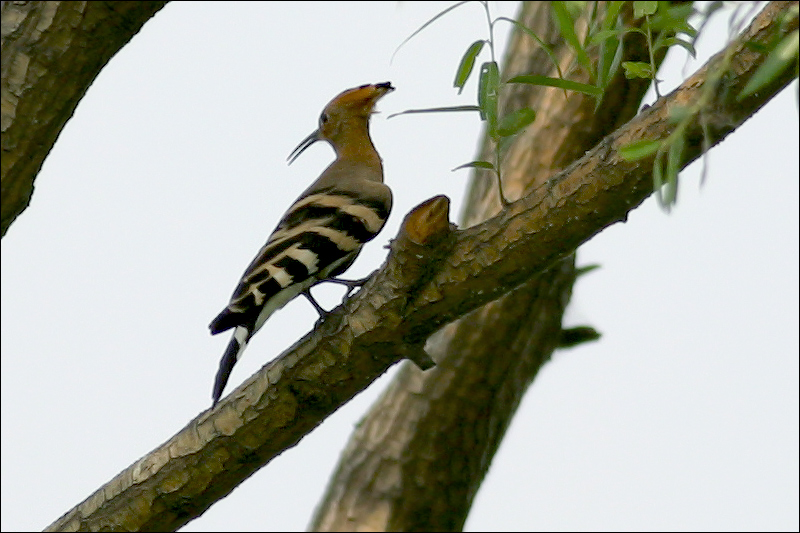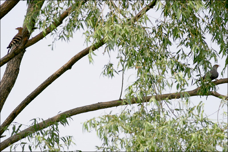 正忙着拍大杜鹃的时候,忽然又飞来一只戴胜,也落在同一棵树上。今天一直拍不好的两个鸟,临别时分忽然凑到一起了!这才叫“凑份子”呢。看着戴胜躲在树干后面探头探脑的样子了,我想起很多体型较小的鸟类都是这样,它们不知为什么总是想找那些比它们个儿大的鸟儿一起玩儿,又害怕,于是往往就弄得这么鬼头鬼脑……