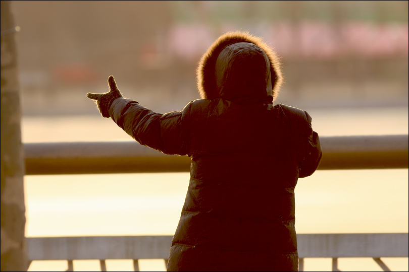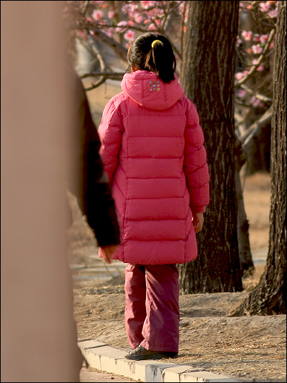| 稍远的冰面上还立着这只白鸭,它一直把脑袋扎在翅膀底下睡觉。就这样单脚站立着睡!我刚把镜头瞄向它,它忽然就醒了。 白鸭横着脚站立的姿式让我联想到一些小女孩(如右图),她们经常也喜欢这样站着,包括我自己小时候。男孩子们就很少这样,不知为什么。