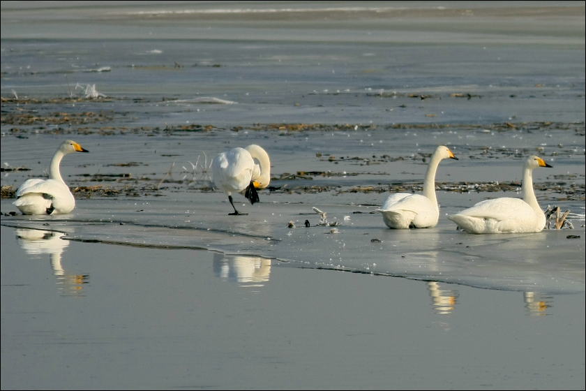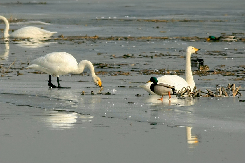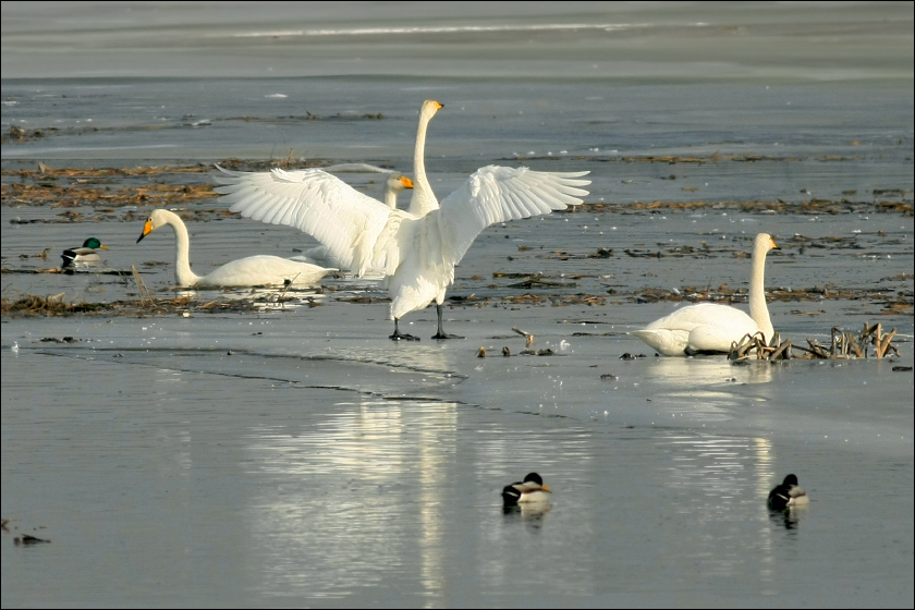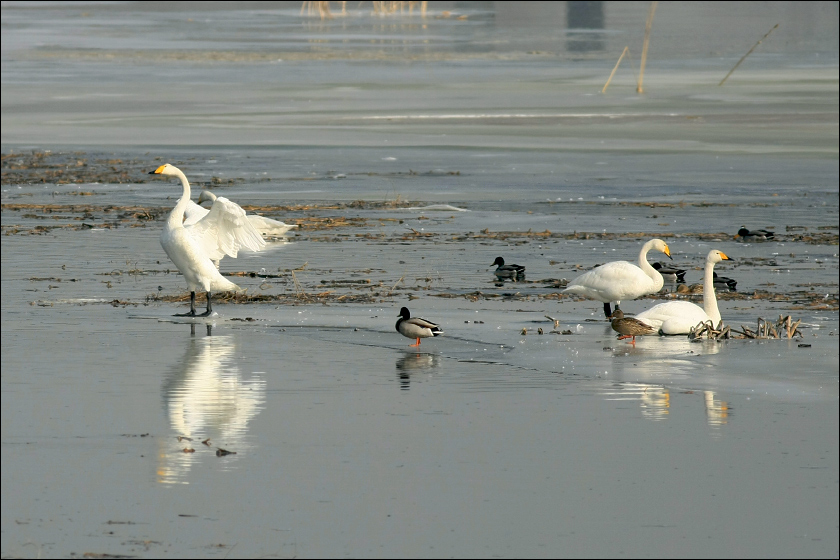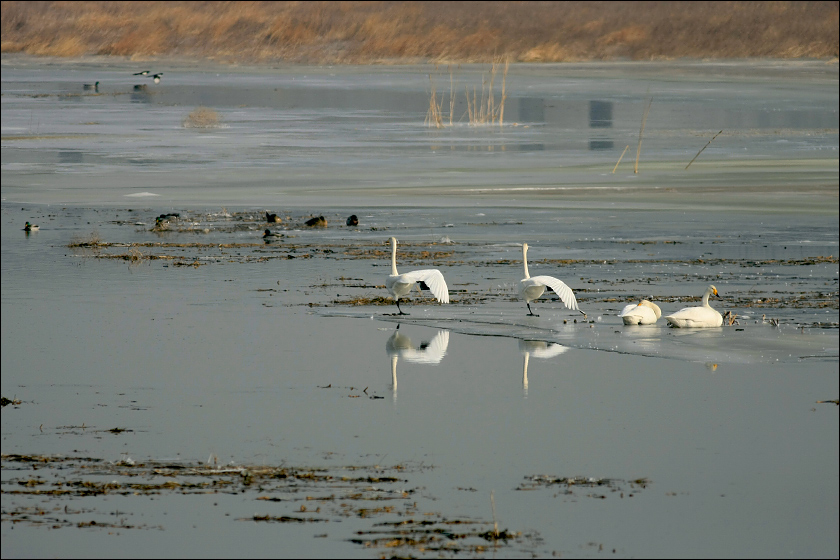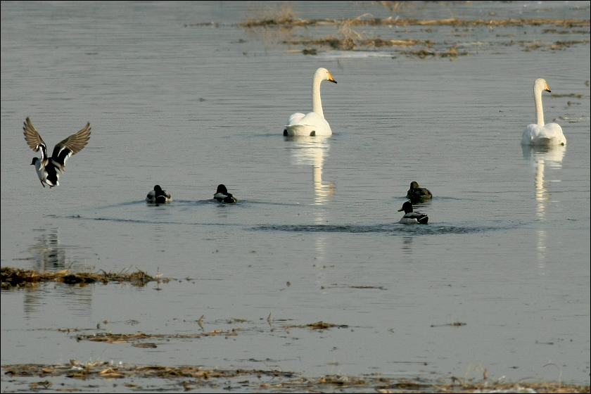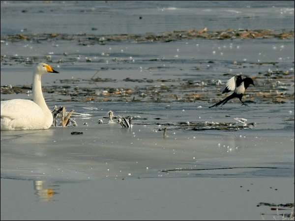 下图中大天鹅们一起回头,是看“本地地主”黑喜鹊在它们面前耍把式……