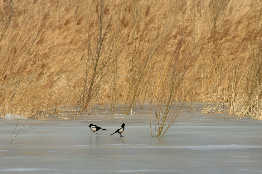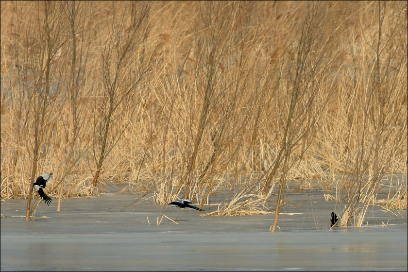 从镜头中看,冬天的芦苇荡很象是小喜鹊们的参天茂密的大森林。![]() |