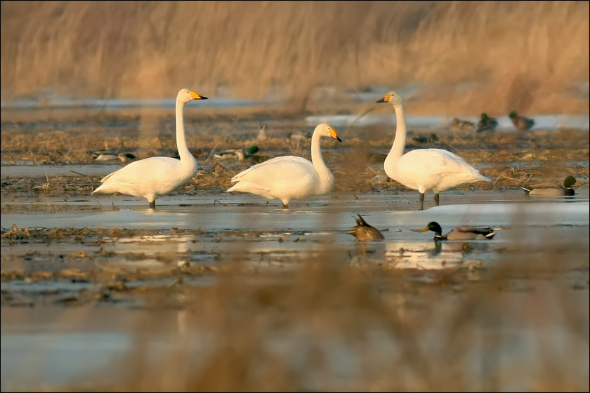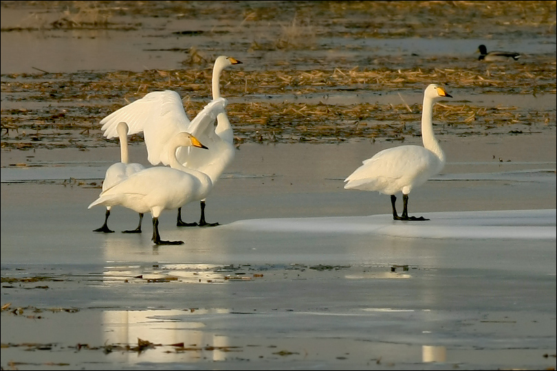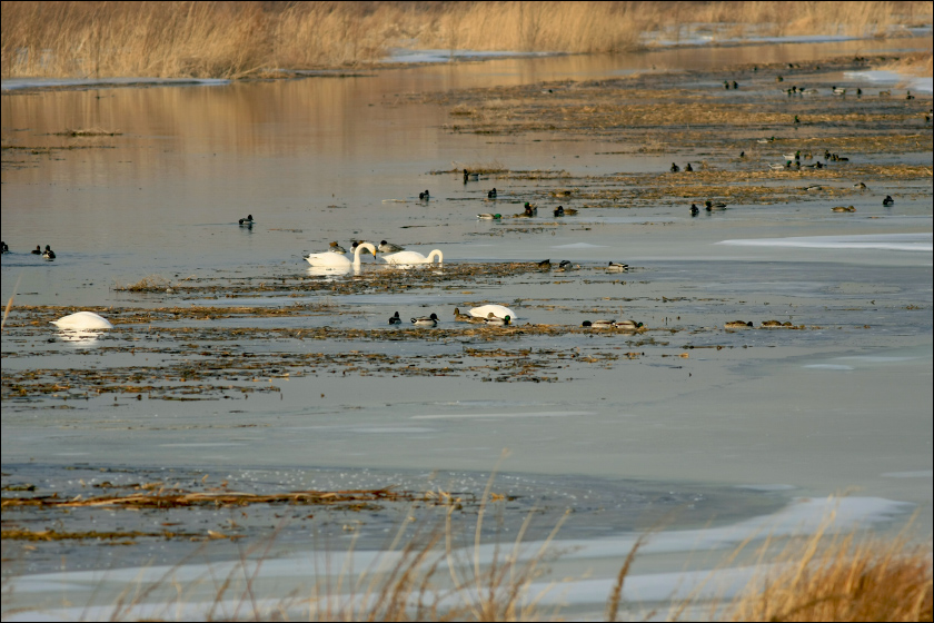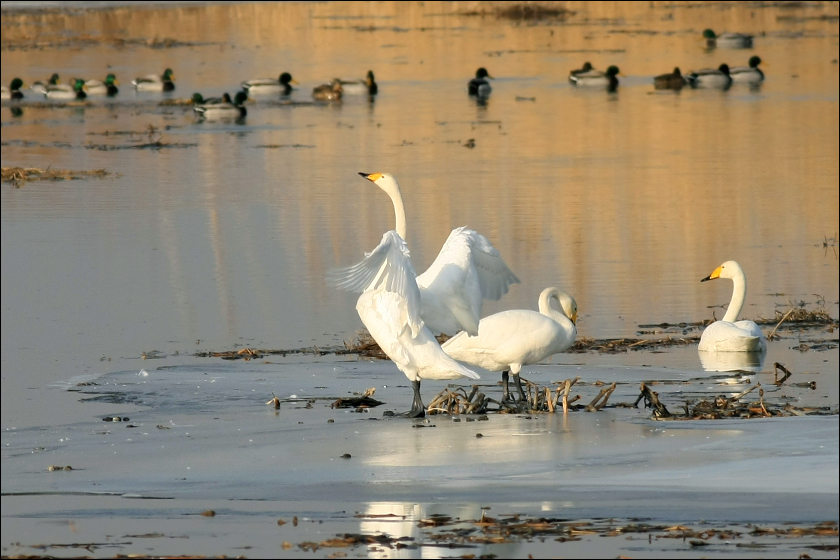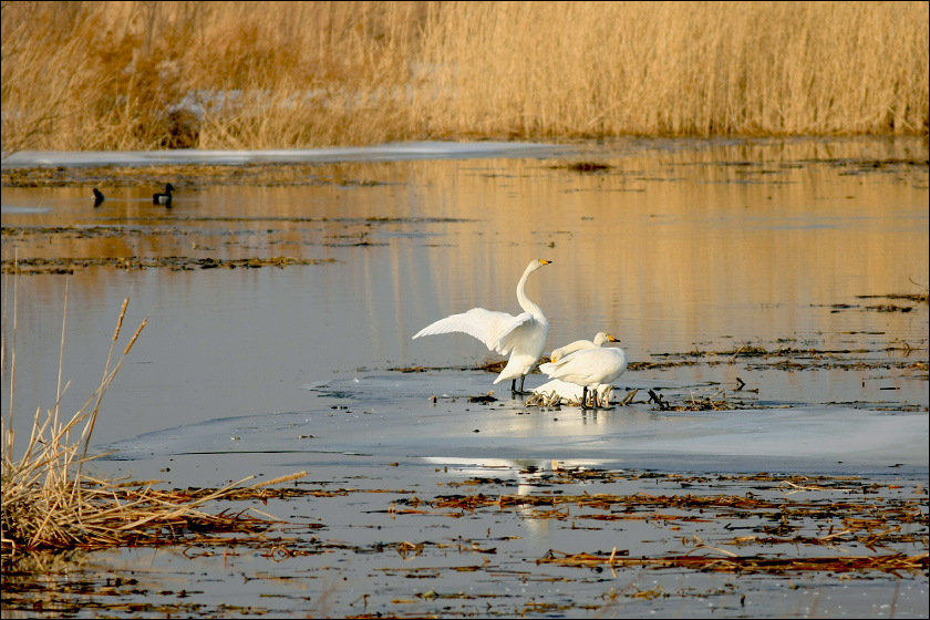 | 我们还是放不下海雕,离开康西草原之后重又转回到午前曾经蹲守的地方。太阳已经西斜,大天鹅们仍在,但眼前的画面与午前相比,完全换了一幅色调了。野鸭湖的冬天,色彩是变来变去的! | ||