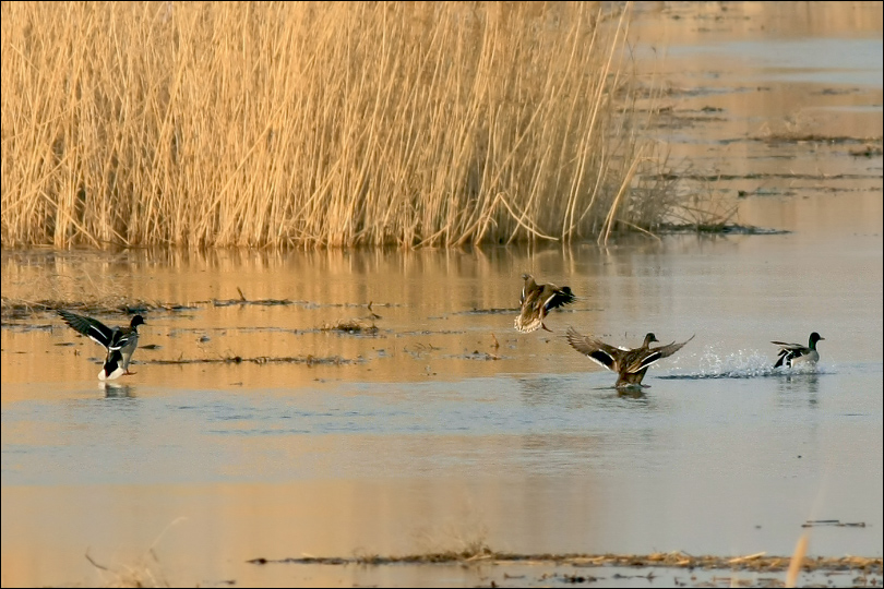| 小鸭们就只能以游击战对付了。但它们显然已司空见惯,海雕一走,立即落回水面。 夕阳下,水面冰面重又是一片和谐世界…… ![]() |