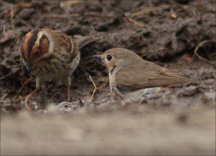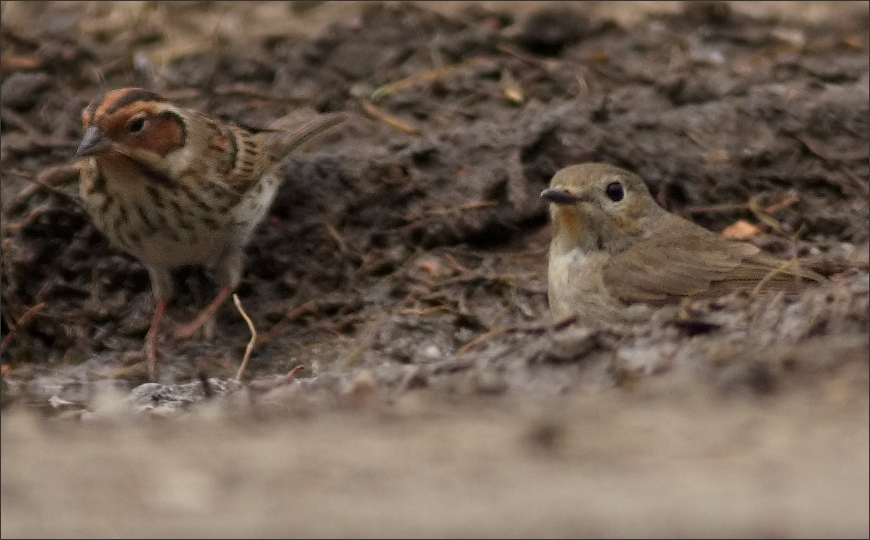 其实随后几天在其它地方也接二连三见到小红喉,今天的片不好,其它就不贴了。我只是一直努力想给它和小鹀拍张合影来着,它们在小泥坑旁边一起喝水,貌似很亲密。