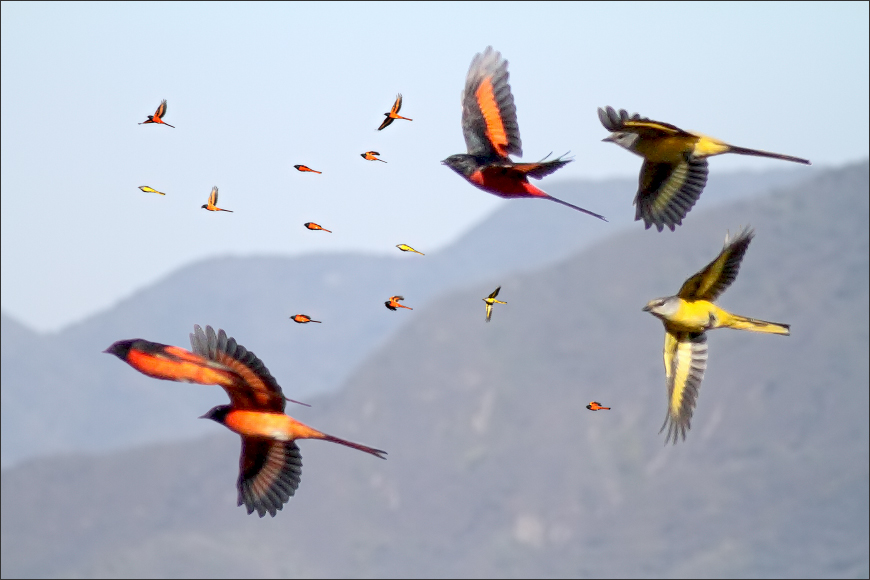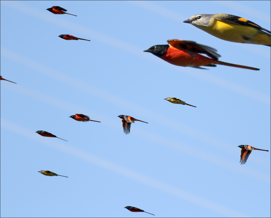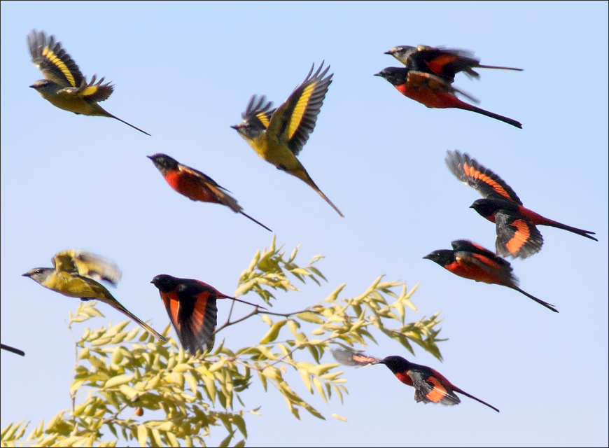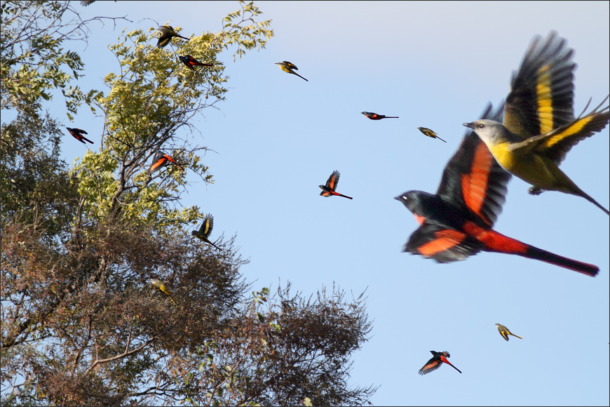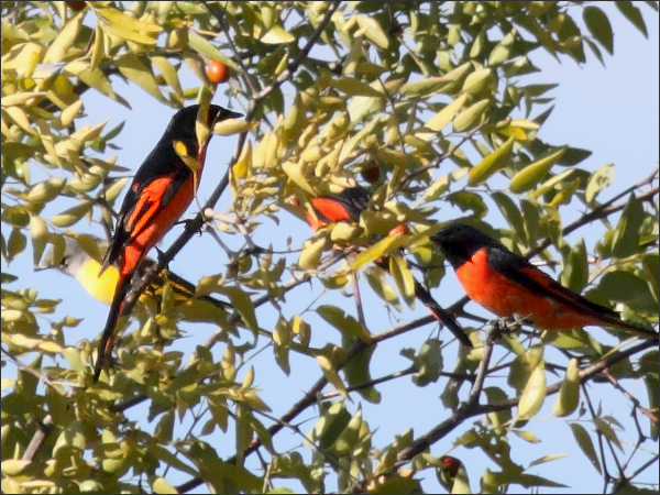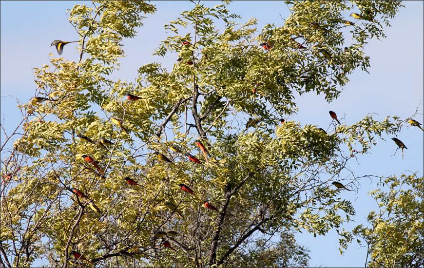 谁能数得清这棵树上共有多少山椒鸟?千万不要以为只是你看到的这一些,枝叶后面还有更多隐藏……