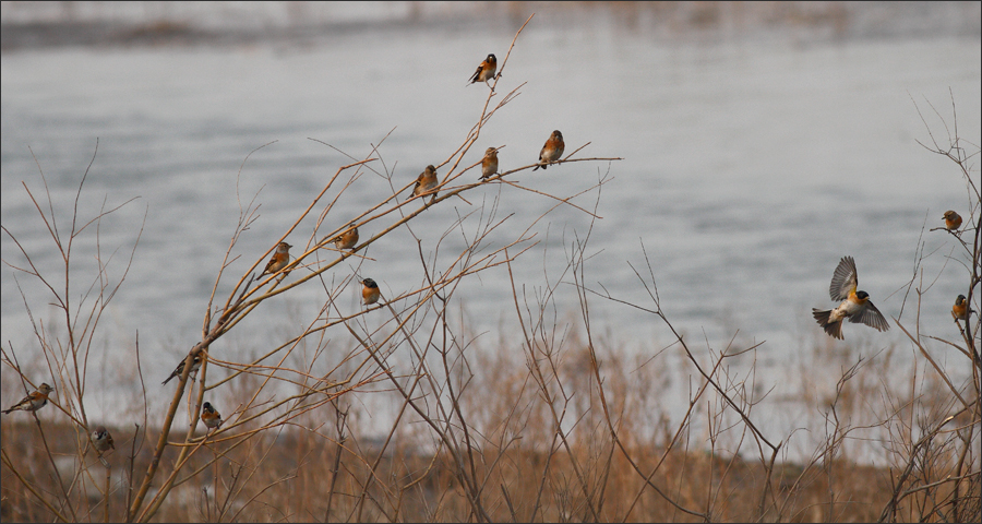 2011年3月30日外出拍鸟,全天收获甚微,黄昏归途中路过永定河,却见这里有大批小鸟扎堆儿。这是迁徙途中的鸟群正临时停落歇息。永定河欢迎你!