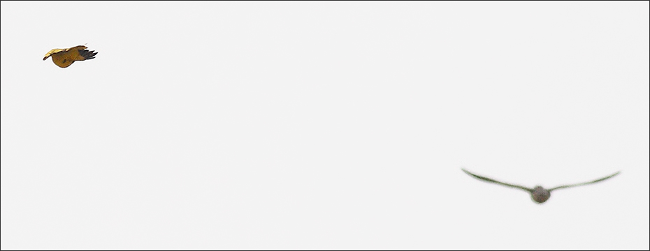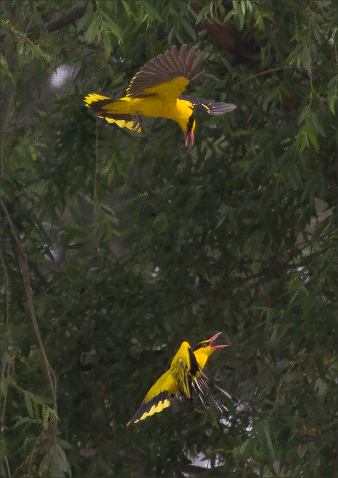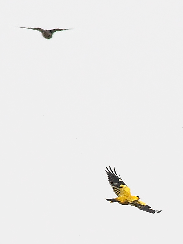 下图是驱逐时的情景,右图则是驱赶到一定范围之外,黄鹂认为巢已安全,随即放弃追击,自行返航。 |