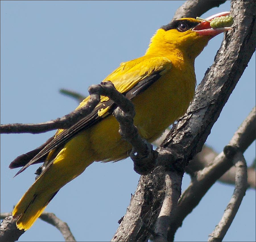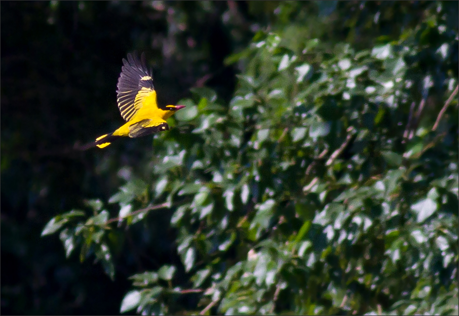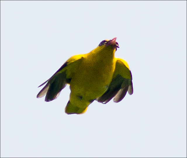 过了20天左右再去,那对儿恋爱的黄鹂还在那里。它们显然已经入洞房了,新家就在这片林子深处。时时可以看见它们由这个位置飞出飞入——居所已经固定,肯定是有巢有蛋了,但暂时还未见任何“送饭”行动。从时间上算,此时应该是在孵化期。