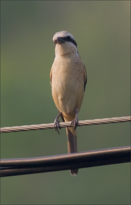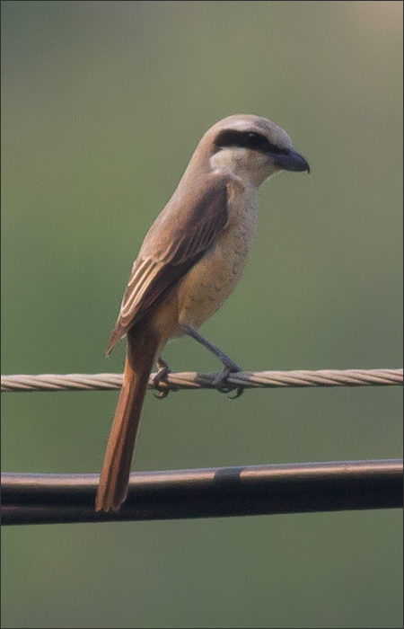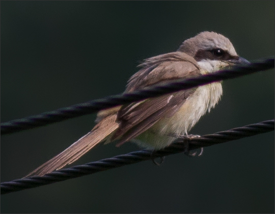 | 第二组两张是在山里,同一只。黑色眼纹,无翼斑,我认为是红尾。 鸟书上说:红尾伯劳的亚成鸟“背及体侧具深褐色细小的鳞状斑纹”,我还是头一次见到这种。那这应该是一只尚未完全成年的小伯劳了。但我后来见到的红尾伯劳幼鸟也并非都有此纹,大概是不同亚种的区别吧。