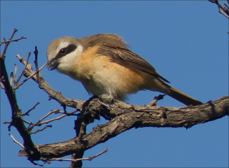 | 前两组照片不是小村周围的,只因这一季的伯劳特别多,所以就归在一起,也算是个记录吧。 第一组摄于永定河边。这两张照片的拍摄地点相距几百米,一个是在绿地中间的花坛附近,另一个在河边小树林里。我不能断定它们是否同一只或同一家,不过应该都是红尾伯劳吧。 |