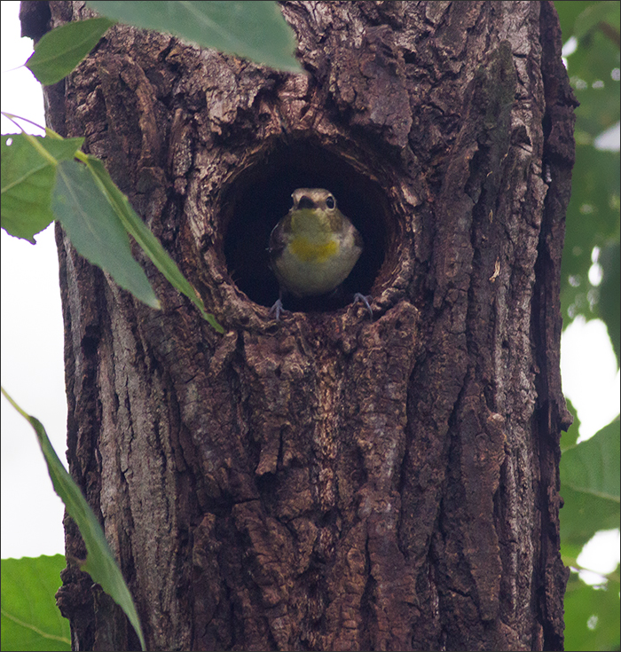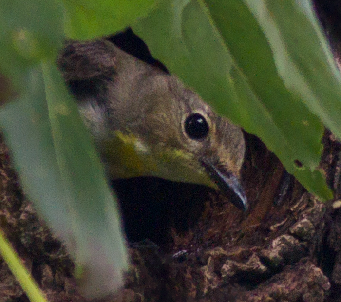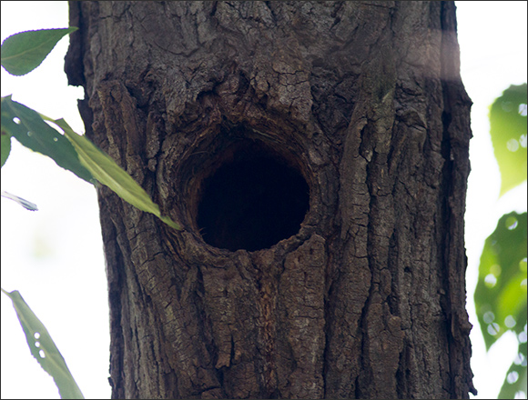 又不知下文。6月15号进山一次,那次是去了别的地方,当天也见到白眉,但相隔数公里,我认为不是我关注的那一对。 6月27号又去了老地方,那天异常安静,没见到白眉,连歌声也没有。 我在林子里茫然瞎逛,逛了很久,后来注意到一个很奇怪的声音——非常微弱细小的鸟鸣声,好象就在附近,却又感觉很远,单声,一声一声地,持续不断。我迟钝了足有20分钟之久,才忽然醒悟到:这是洞穴中刚刚出生的幼鸟!当然那时我还断定不了这是谁家的孩子…… 顺着声音找去,看到了这个树洞。我刚刚举起相机,白眉MM突然从洞中钻出来。大家非常意外地打了个照面,她吓了一跳,我也吓了一跳! |