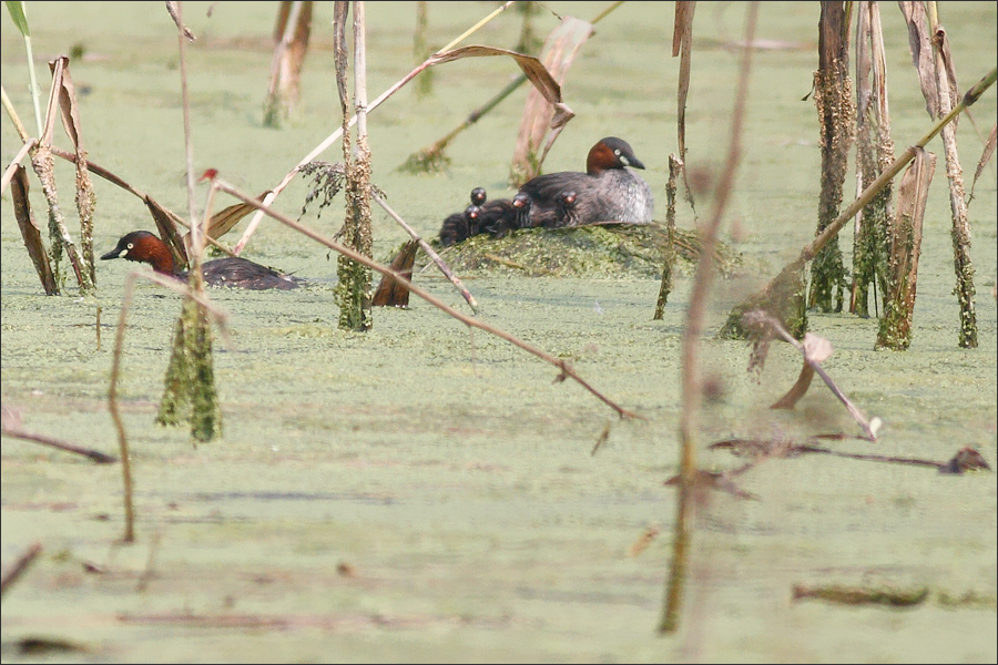 这块地不知原先种的什么,现在看上去残叶稀疏,显得比较开阔。巴掌大的区域内,我见到三对小PT正在这里“扎堆儿”孵育后代。进展最快的这对儿已有四个小宝宝出生,PT妈妈仍在趴窝,看来它身下还有蛋…… |