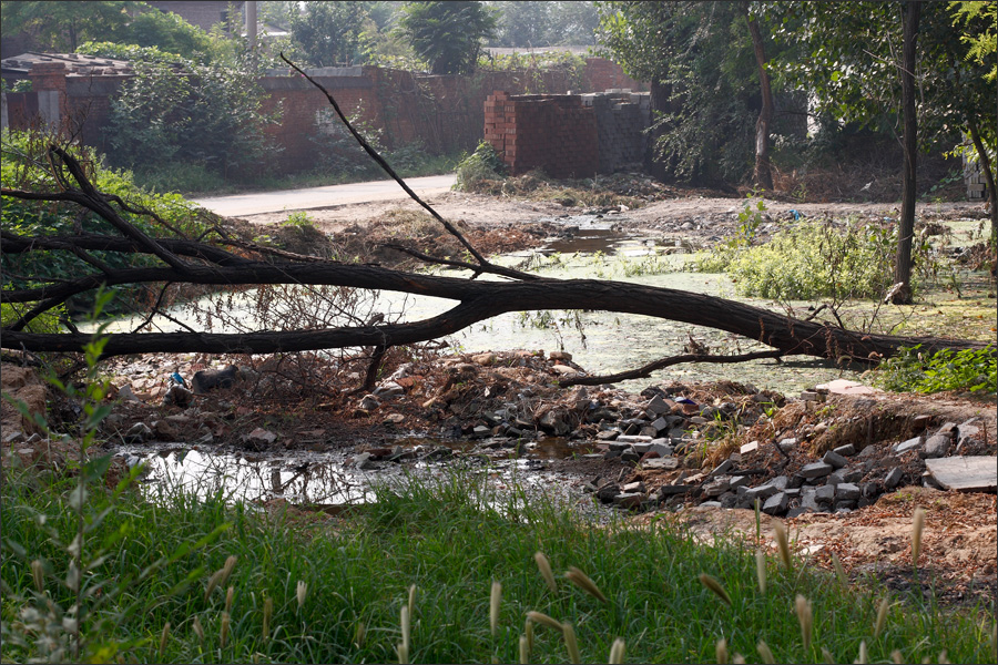 村头倒伏的枯树。这里本来是一片林子,很茂密,从我拍照的位置应该看不到对面的小马路。现在整片林子都不知哪去了,那些树全倒了?都被拉走了?也许眼前这棵枯树只是因为朽了、没用了,才被暂时遗弃在这里吧。![]() |