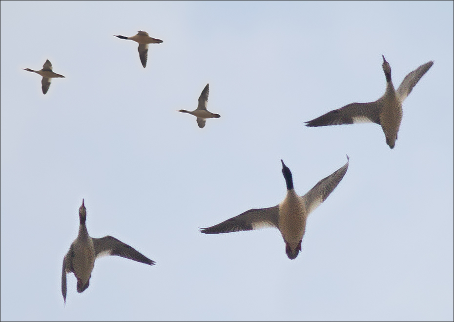 | 三月,春季大迁徙之初,大雾天气,三只普通秋沙鸭从我窗口飞过。如果是绿头鸭之类的,我的惊讶也许还少一点,毕竟它们种群数量较大。但秋沙鸭即使在河湖地区也属“少数民族”,何况这是在北京城区上空! 实际上我一直猜想,鸭类多半是在夜间赶路的,因为野鸭那~~么多,却很少见到它们批量过境的情景。这三只象是一家子,估计它们是在大雾之中迷失了,或是受到什么惊扰,慌不择路。无论如何,“满城飞鸭子”总是很奇怪的,我目送它们远去,祝愿它们一路平安! ![]() |