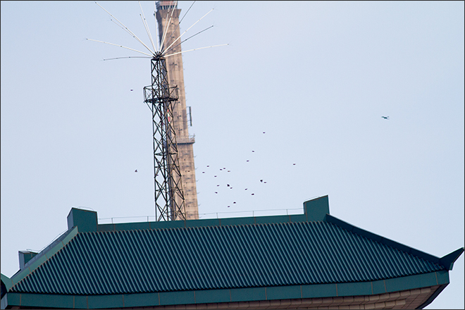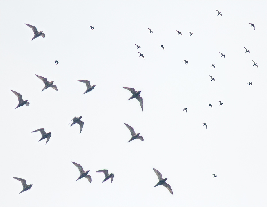 下面是5月12号,窗前飞过挺大的一群。感觉象是水鸟,鸻鹬类的,但我对水禽非常不熟悉,又远,实在辨识不清。可能又是迷路的,从西北方向飞来,甩了一个大弯儿,转向东北飞去。![]() |