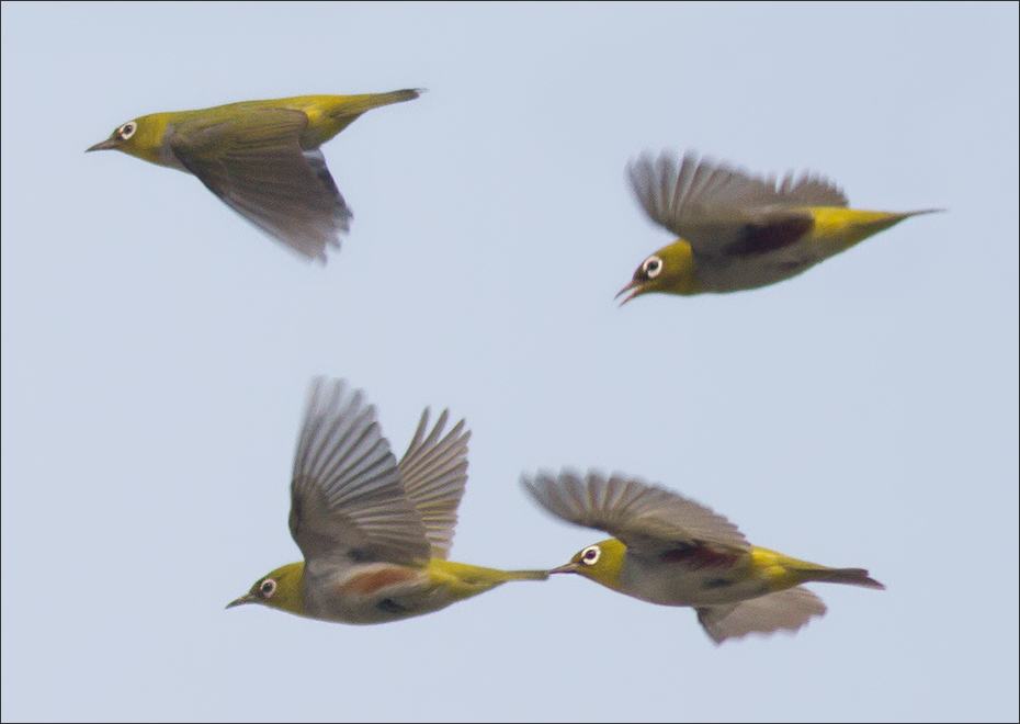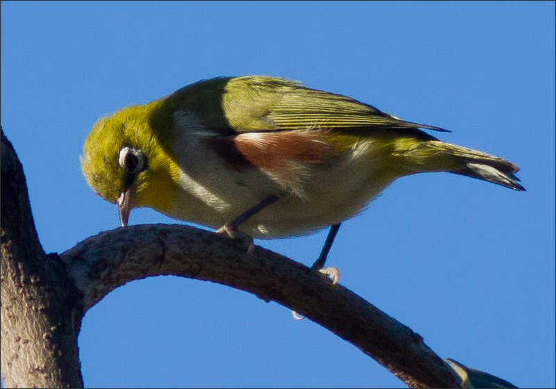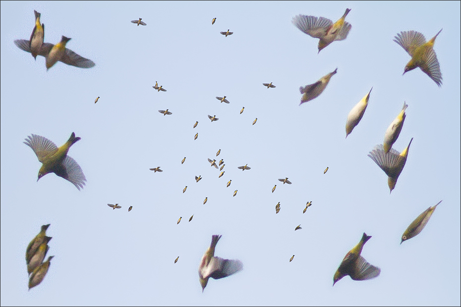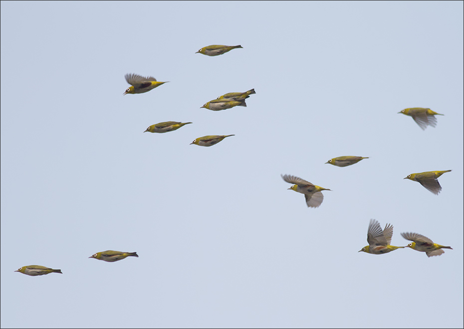 | 次日,10月3号,一小群绣眼鸟落在窗前柿子树上。已经十多天了,没想到还有绣眼! “有史以来”总是看着它们从高空疾驰而过,没想这回竟如此赏光,终于可以从容地看看它们了。