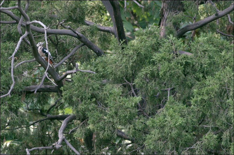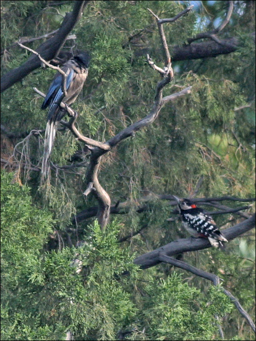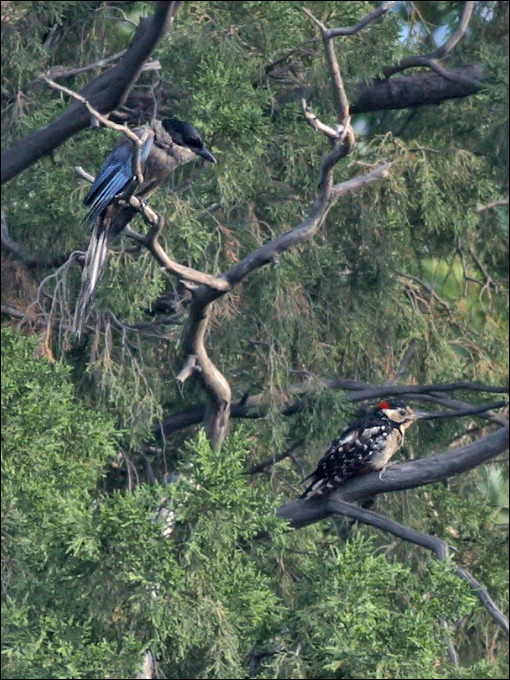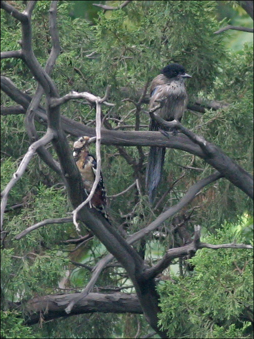 那天我正在拍这只老鹊,镜头里忽然钻进一个东西,定睛一看原来是小啄木鸟来了。但这只小啄木鸟的脑后没有“红头绳”,所以这不是平时那个男孩子,这是另外一只小啄木鸟,而且这是一个MM。 |