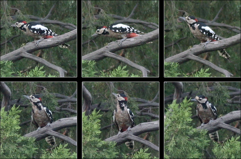我拍到这张照片的那次,小啄木鸟又在它们的“老地方”惆怅着。正在这时,“坏鸟儿”又来了,于是难过被迫中止,又一轮儿“捉迷藏”游戏开始了…… |
